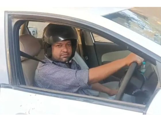 জরিমানার ভয়ে হেলমেট পরে গাড়ি চালাচ্ছেন এক যুবক