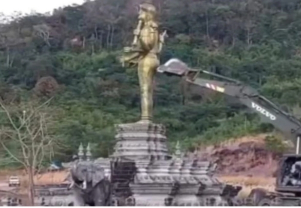 ভাইরাল হওয়া ভিডিওতে দেখা গিয়েছে, জেসিবি মেশিন ব্যবহার করে বিরাটাকার মূর্তিটিকে ভেঙে ফেলছে একদল লোক। কিছু মানুষ দূরে দাঁড়িয়ে এই ধ্বংসযজ্ঞ দেখছেন। প্রসঙ্গত, চলতি বছরের জুলাই মাসে টানা পাঁচদিন যুদ্ধ চলে দক্ষিণ-পূর্ব এশিয়ার দুই দেশ থাইল্যান্ড এবং কম্বোডিয়ার মধ্যে। অন্তত ৪০ জনের মৃত্যু হয় দু’পক্ষে। তিনদিন গোলাবর্ষণের পর থাইল্যান্ডের কাছে যুদ্ধ থামানোর আর্জি জানায় কম্বোডিয়া। যদিও সে প্রস্তাব কানে তোলেনি থাইল্যান্ড। শেষ পর্যন্ত মালয়েশিয়ার প্রধানমন্ত্রী আনোয়ার ইব্রাহিমের মধ্যস্থতায় সম্পূর্ণ সংঘর্ষবিরতিতে রাজি হয় দু’পক্ষ। যদিও মার্কিন প্রেসিডেন্ট ডোনাল্ড ট্রাম্প দাবি করেন, তাঁর প্রচেষ্টাতেই হিংসা বন্ধে রাজি হয়েছে থাইল্যান্ড ও কম্বোডিয়া।