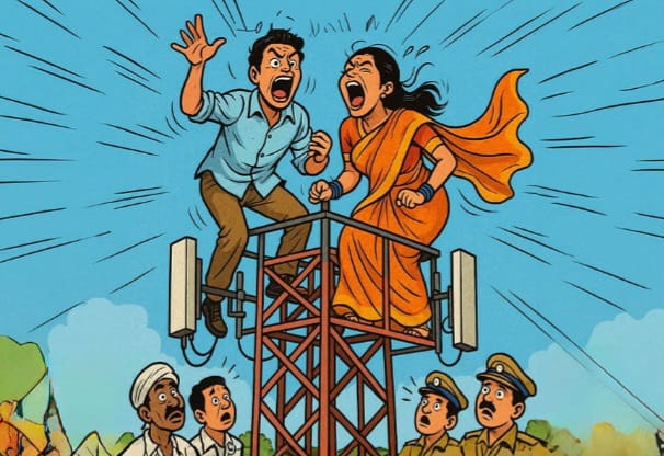 সে এক বিচিত্র ঘটনা। আর সেটাই আজকের অফবিট নিউজ। ভালোবাসার সম্পর্ক মেনে নেয়নি পরিবার। অভিমানে আত্মহত্যা করার জন্য মোবাইল টাওয়ারের মাথায় উঠে বসল প্রেমিক যুগল! তেহট্টের ভবানীপুর এলাকায় এই গুজব নিয়ে শোরগোল শুরু হয়। খবর পেয়ে ঘটনাস্থলে যায় তেহট্ট থানার পুলিশ, ছুটে যায় বড় র‌্যাডার যুক্ত দমকলের একটি ইঞ্জিন। শনিবার রাত সাড়ে ১০টা নাগাদ দমকলের কর্মীরা টাওয়ারের মাথায় উঠে দেখেন সমস্তটাই গুজব। কেবলমাত্র টাওয়ারের নিচে পড়ে রয়েছে দু’জোড়া চটি।