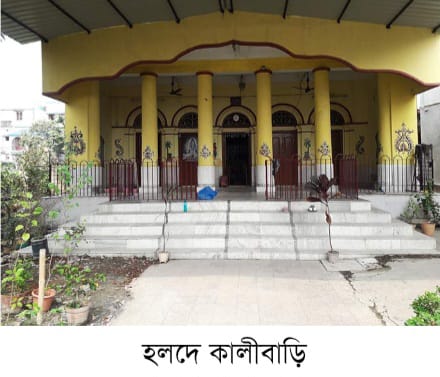 ১) হলদে কালীবাড়ি: ইতিহাস বলছে মন্দিরের বয়স ৩২৯ বছর। এলাকার তৎকালীন প্রতিপত্তিশালী ব্যক্তি ঈশান চক্রবর্তী’র জামাই ত্রৈলোক্যনাথ মুখোপাধ্যায় ১৬৯৪ সালে মন্দিরটি প্রতিষ্ঠা করেন বলে জানা যায়। দেখলাম কালী পুজো উপলক্ষ্যে মন্দিরের গ্রিল রঙ করা হচ্ছে। কথা হল সুদীপ্ত ভৌমিকের সঙ্গে, তিনি মন্দিরের বর্তমান উত্তরাধিকারীদের আত্মীয়। তাঁর কথায় “মন্দিরে কালী দক্ষিণা কালী, আনন্দময়ী।” ইতিহাসের অনুসন্ধান করে জানলাম, মন্দির প্রতিষ্ঠার সময় কাশীধাম থেকে কষ্টিপাথরের কালী নিয়ে আসা হয়েছিল।