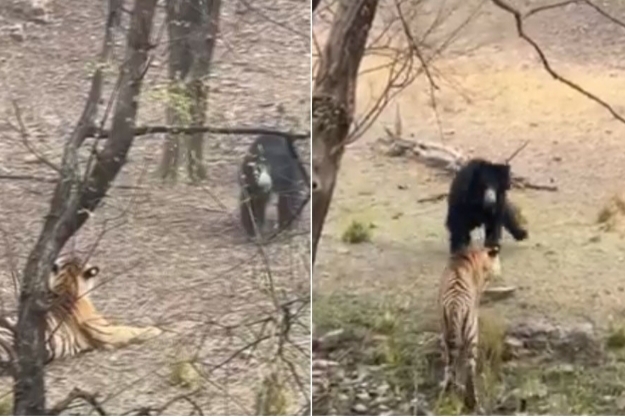 ভালুকটি প্রথমে পালাতে গেলে বাঘটি পিছু নেয়। এরপরই রুখে দাঁড়ায় ভালুকটি। নিজেকে রক্ষার তাগিদে সতর্ক করতে থাকে বাঘটিকে। তার নানা কাণ্ড দেখে মাটিতে বসে পড়ে বাঘটি। সঙ্গে সঙ্গে ঘটনাস্থল থেকে পালিয়ে যায় ভালুকটি। হতবাক হয়ে কিছুক্ষণ সেখানেই বসে থাকে বাঘটি। এরপর শিকার হারানোর পর ক্লান্ত শরীরে ফিরে যায় বাঘটি।